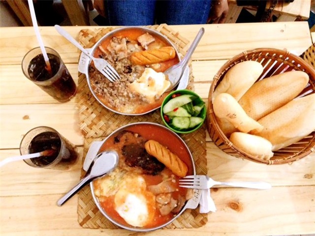 Bánh mì chảo Cột Điện Quán: Quán ăn bánh mì chảo ở khu vực nhà C3 tập thể Nghĩa Tân được nhiều bạn trẻ “săn đón”. Tuy quán đường nằm sâu trong ngõ, bất kể đông hay hè, quán lúc nào cũng đông khách. Một suất bánh mì chảo đầy đủ dinh dưỡng 36.000 đồng với bánh mì giòn, pate thơm ngon, khoai tây nghiền, trứng ốp vừa phải cùng miếng thịt và xúc xích rưới nước sốt sền sền chua ngọt đậm đà. Ảnh: Lạc An.