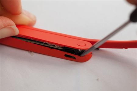 Ban đầu, dùng tua vít để tháo phần điều khiển trên kính Google Glass ra khỏi phần gọng titan. |