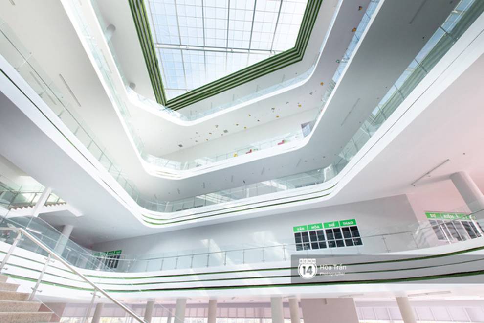 Không gian bên trong của nhà văn hóa được tối ưu ánh sáng từ nguồn sáng tự nhiên kết hợp cùng việc bố trí không gian mở giúp sinh viên cảm thấy thoải mái và thích thú khi học tập, sinh hoạt ngoại khóa tại đây.