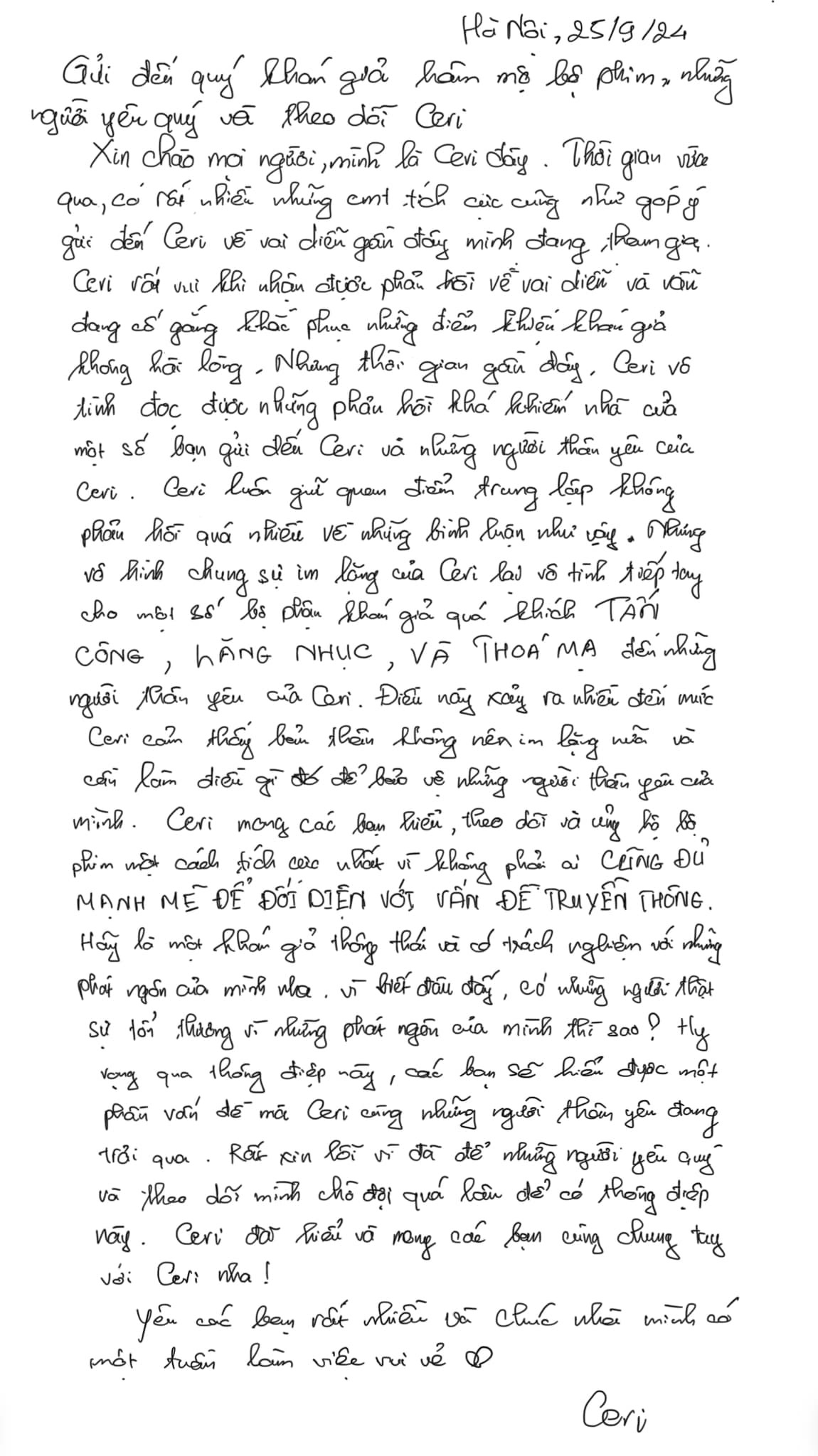 Cô viết: “Thời gian qua, có rất nhiều bình luận tích cực góp ý đến Thu Hà Ceri về vai diễn gần đây mình đang tham gia. Mình rất vui khi đón nhận phản hồi về vai diễn và vẫn đang khắc phục những điểm khán giả không hài lòng. Nhưng thời gian gần đây, mình nhận được những bình luận khá khiếm nhã của một số bạn gửi đến mình cũng như người nhà. Mình luôn giữ quan điểm trung lập, không phản hồi quá nhiều về những bình luận như vậy. Nhưng sự im lặng của mình lại vô tình tiếp tay cho một bộ phận khán giả quá khích tấn công, lăng nhục và thóa mạ đến những người thân yêu của Ceri. Điều này xảy ra nhiều đến mức Ceri nhận thấy mình không nên im lặng nữa và cần làm gì đó để bảo vệ gia đình”.
