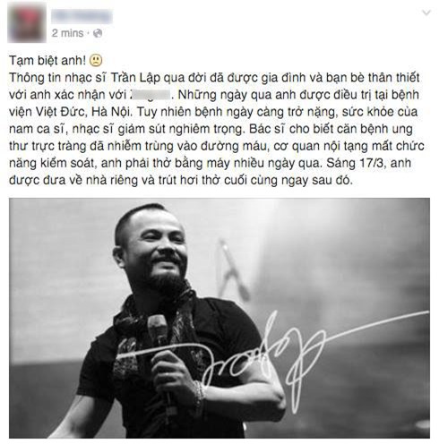 Sau 4 tháng chiến đấu với bệnh ung thư trực tràng, nhạc sĩ Trần Lập đã qua đời tại nhà riêng tại Hà Nội ở tuổi 42. Theo người thân của Trần Lập cho biết, những ngày qua anh được điều trị tại bệnh viện Việt Đức, Hà Nội. Thế nhưng, tình trạngsức khỏe của nam ca sĩ, nhạc sĩ giảm sút nghiêm trọng.