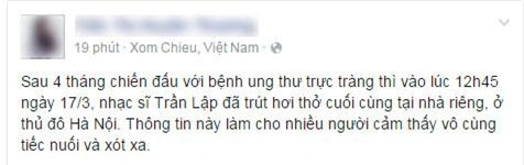 Ngay sau khi thông tin nhạc sĩ Trần Lập qua đời được đăng tải trên mặt báo, cộng đồng mạng khá hoang mang và liên tục chia sẻ những dòng trạng thái chia buồn cùng gia đình anh.