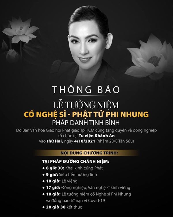 Cùng ngày, thông tin về lễ tưởng niệm chính thức của ca sĩ Phi Nhung được chia sẻ. Theo đó, lễ cúng, viếng sẽ diễn ra vào lúc 10 giờ ngày 4/10 (nhằm ngày 28/8 âm lịch) tại Tu viện Khánh An.