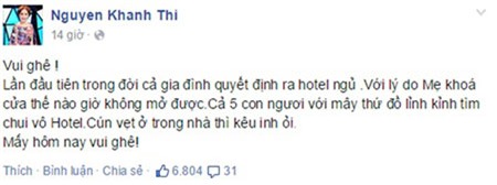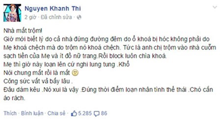 Khánh Thi viết: "Nhà mất trộm! Giờ mới biết lý do cả nhà đứng đường đêm do ổ khoá bị hóc không phải do mẹ khoá chệch mà do trộm nó khoá chệch. Tức là anh chị trộm vào nhà cuỗm sạch tiền của mẹ và ít đồ nữ trang, rồi "block" luôn chìa khoá.