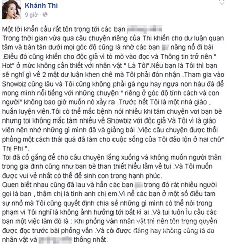 Cách đây ít giờ, Khánh Thi đăng tải một đoạn status khá dài. Trong tâm thư, nữ kiện tướng dancesport tỏ ra khá bức xúc khi một số lời chia sẻ của mình đã bị thổi phồng. Những điều sai sự thật này đang ảnh hưởng đến công việc cũng như cuộc sống của cô. Nhân đây, bà bầu Khánh Thi mong muốn mọi người hãy tôn trọng cô!