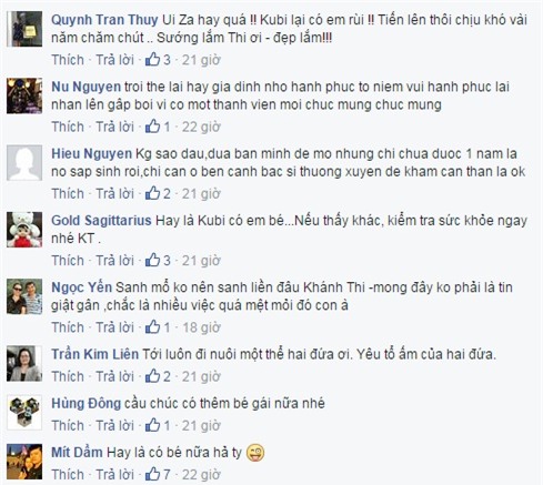 Chỉ sau vài giờ đăng tải, dòng chia sẻ của Khánh Thi đã nhận được nhiều sự quan tâm từ phía cộng đồng mạng. Không ít người khẳng định rằng chắc chắn cô đang mang bầu lần 2 và đang trong giai đoạn đầu của thai kỳ nên chưa phát hiện ra. Đồng thời, họ cũng dành cho cô những lời ngợi khen “có cánh” và không quên chia sẻ kinh nghiệm, động viên và chúc mừng Khánh Thi sắp lên chức mẹ.