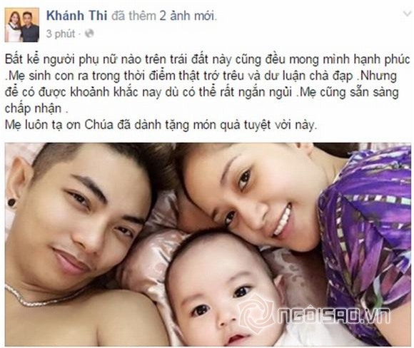 Mới đây, trên trang cá nhân của mình, Khánh Thi đã đăng tải hình ảnh hạnh phúc bên Phan Hiển và con trai cùng lời chia sẻ: "Bất kể người phụ nữ nào trên trái đất này cũng đều mong mình hạnh phúc. Mẹ sinh con ra trong thời điểm thật trớ trêu và bị dư luận chà đạp. Nhưng để có được khoảnh khắc này dù có thể rất ngắn ngủi, mẹ cũng sẵn sàng chấp nhận. Mẹ luôn tạ ơn Chúa đã dành tặng món quà tuyệt vời này".