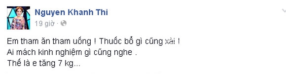 Mới đây, Khánh Thi thoải mái phấn khích đăng tải hình ảnh của mình cùng dòng chia sẻ: "Em tham ăn tham uống. Thuốc bổ gì cũng xài. Ai mách kinh nghiệm gì cũng nghe. Thế là em tăng 7 kg...".