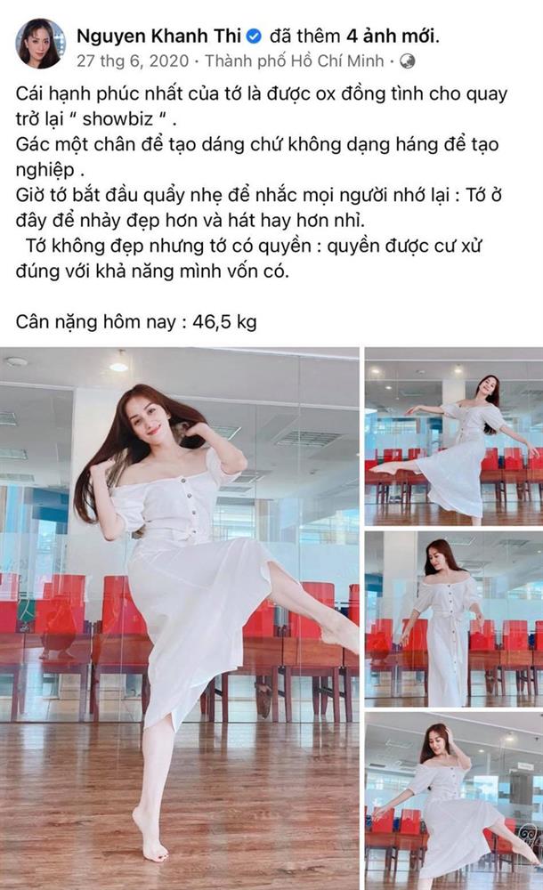 Trong một lần khác, nữ ca sĩ cũng đăng đàn ẩn ý: "Cái hạnh phúc nhất của tớ là được ông xã cho quay trở lại showbiz. Gác một chân để tạo dáng chứ không dạng háng để tạo nghiệp. Giờ tớ bất ngờ quẩy nhẹ để nhắc mọi người nhớ lại: Tớ ở đây để nhảy đẹp hơn và hát hay hơn nhỉ. Tớ không đẹp nhưng tớ có quyền được cư xử đúng với khả năng mình vốn có".