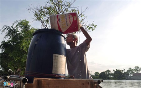 Kẽo kẹt bên chiếc xe bò, ông Nguyễn Văn Tổng (64 tuổi, trú xóm Mỗ) múc từng thùng nước dưới ao đổ vào thùng phuy. Phải mất nhiều lần, người đàn ông này mới đổ đầy thùng nước 100 lít rồi kéo xe gần nửa km về nhà. Nước ao sau đó được đổ vào bể trước sân, bơm lên bể lọc.