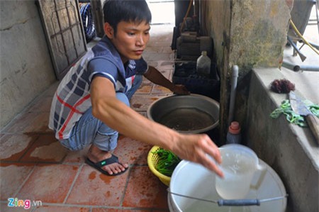 Ngồi múc từng ca nước ra chậu rửa rau chuẩn bị bữa trưa cho gia đình, anh Nguyễn Văn Tuấn (31 tuổi, trú xóm Ngánh, thôn Ngọc Than) cho hay, hàng ngày nước nấu cơm, đun uống phải mua theo bình với giá từ 12.000-15.000 đồng mỗi 20 lít. Mọi sinh hoạt khác trong gia đình vẫn phải sử dụng nước ao làng.