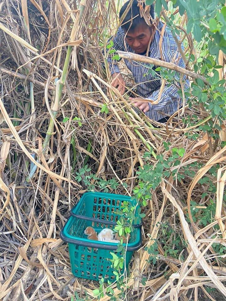 Bố chui vào bụi rậm rồi đỡ từng bé mèo lên nâng niu.