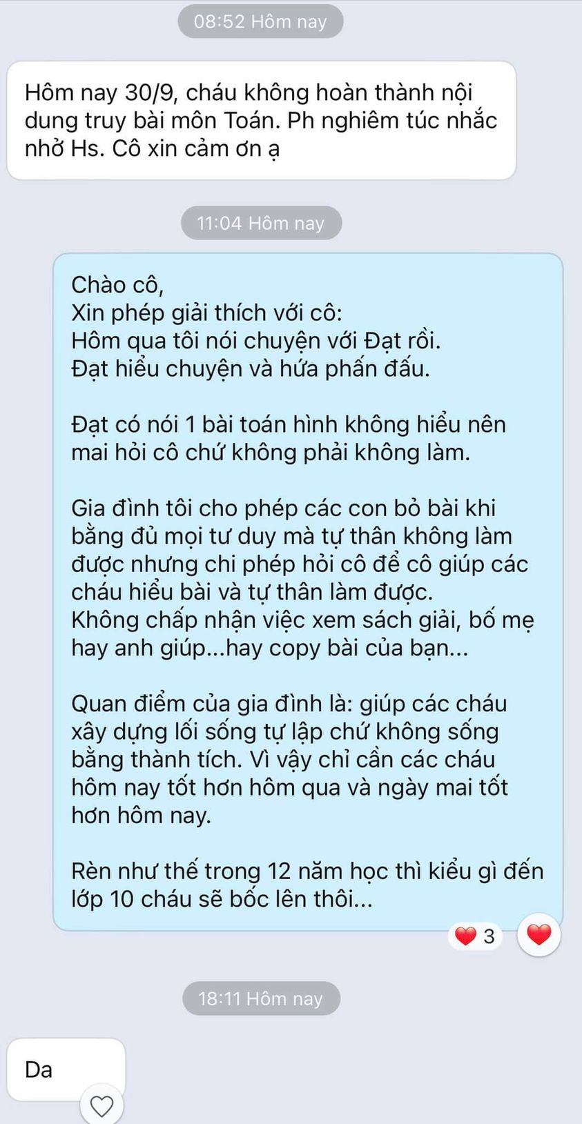 Tin nhắn trao đổi giữa phụ huynh này và cô giáo đã được chính chủ đưa lên mạng xã hội và thu hút sự chú ý của nhiều bậc cha mẹ khác.