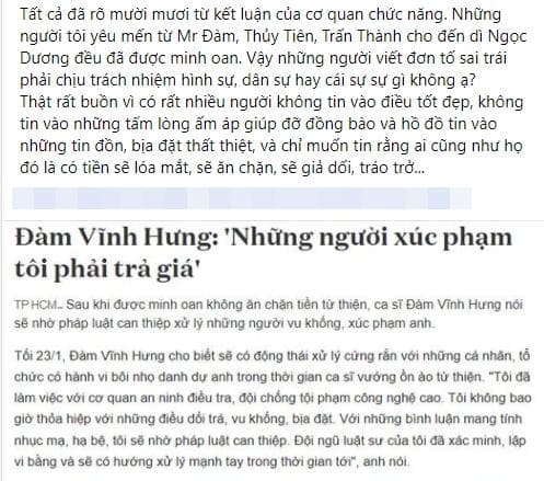 Cách đây một ngày, Cơ quan CSĐT Bộ Công An đã công bố về việc nghệ sĩ Việt bị tố ăn chặn từ thiện. Căn cứ vào tài liệu, chứng cứ được xác minh, xác định ca sĩ Thủy Tiên, Đàm Vĩnh Hưng, MC Trấn Thành, MC Đại Nghĩa và bà Nguyễn Thị Hương - mẹ ruột Hà Hồ không có hành vi gian dối, không chiếm đoạt tiền từ thiện do người dân đóng góp. Trước thông tin này, những người thân thiết của các nghệ sĩ đã đồng loạt đăng tin chúc mừng.