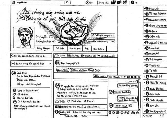 Điều thú vị hơn nằm ở danh sách bạn bè của tác gia Nguyễn Du. Dường như ông có thể kết bạn xuyên thời gian, từ những nhân vật trong tác phẩm, tác giả cùng thời đến cả những tác giả văn học hiện đại.