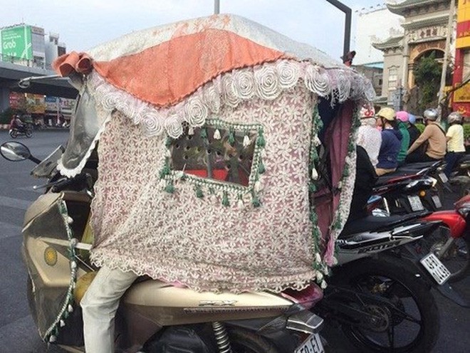 Đây có lẽ là cách để khiến chị mát mẻ hơn, đỡ bị nắng chiếu khi di chuyển trên đường phố dưới thời tiết gần 40 độ.