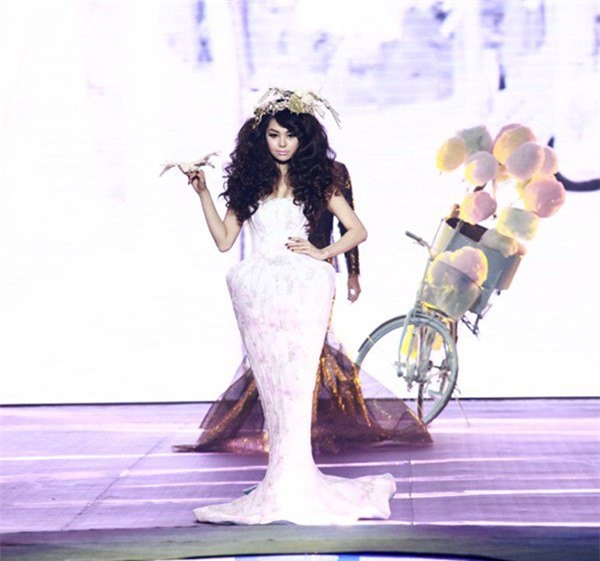 Lý Nhã Kỳ từng hiếm hoi nhận lời mời catwalk, cô hóa cô dâu kiêu kỳ trong chiếc váy cưới đuôi cá khá đẹp mắt.