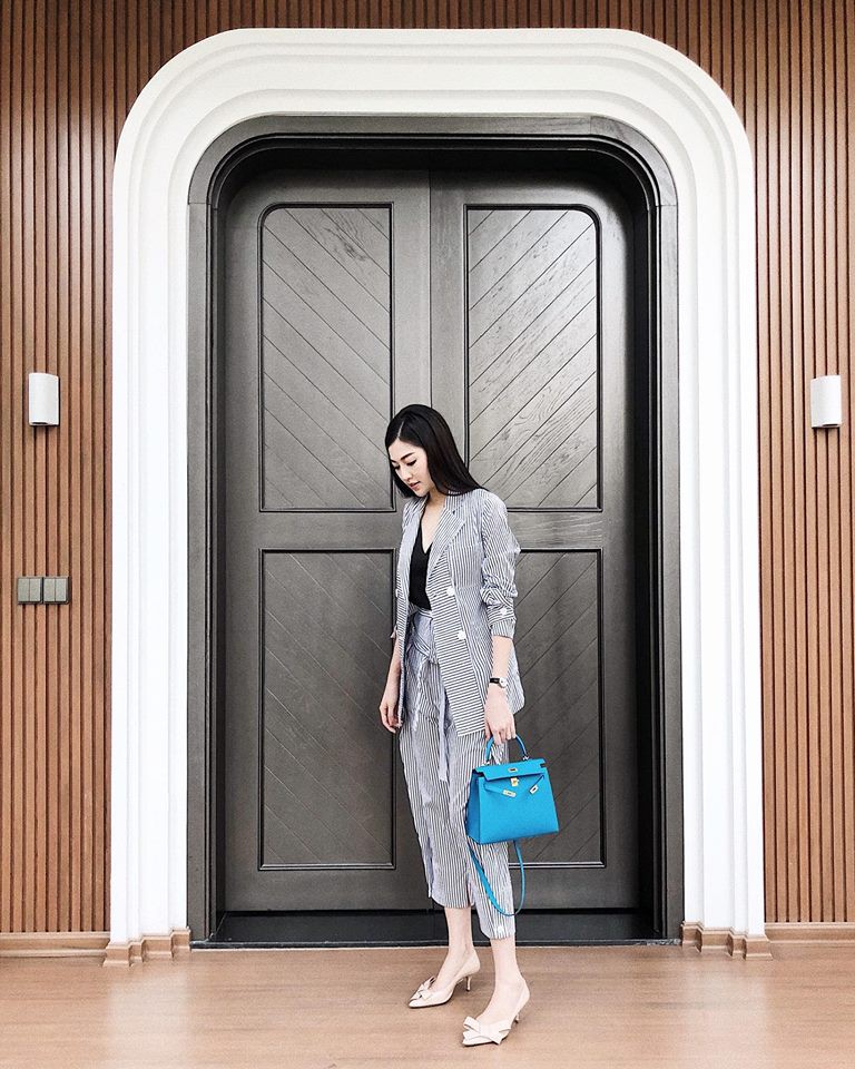 Á hậu Huyền My vẫn gắn bó với tông đen quen thuộc, tô điểm phong cách bằng kiểu kính "siêu nhân" và túi Hermes đắt giá.