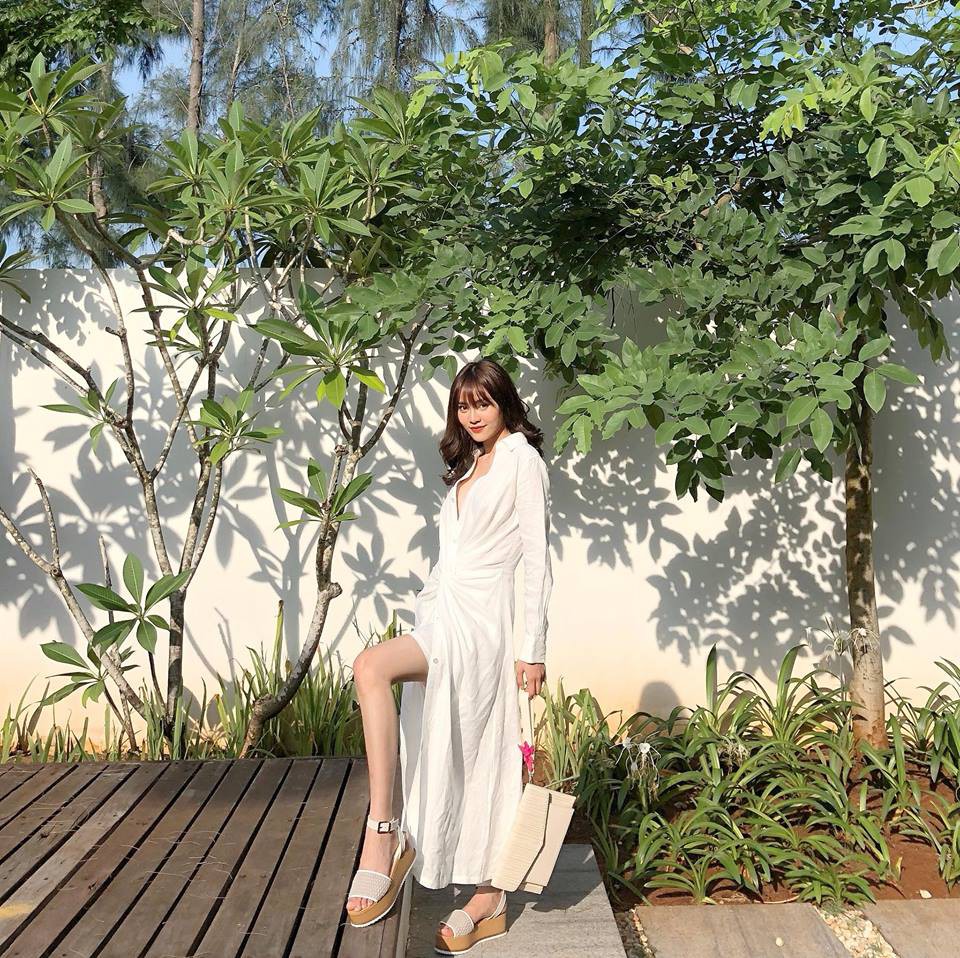 Street style mùa hè của các sao lại được tiếp nối với kiểu đầm linen thoáng mát sành điệu của Ninh Dương Lan Ngọc. Kèm theo đó là đôi sandals đế bánh mì - sự lựa chọn hoàn hảo cho những nàng khiêm tốn chiều cao nhưng vẫn ưa thoải mái năng động.