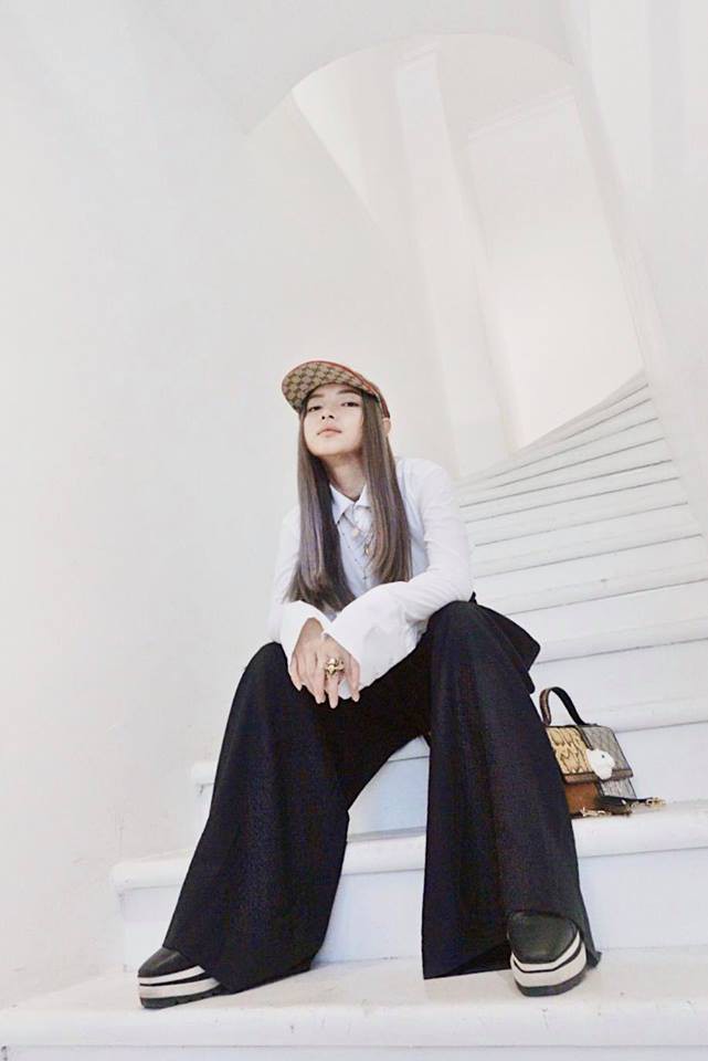 Chiếc áo sơmi trắng quen thuộc được Châu Bùi biến tấu với một hình ảnh street style thật sự khác lạ: kết hợp cùng quần ống rộng thùng thình, chân đi giày đế bánh mì và đội mũ lưỡi trai.