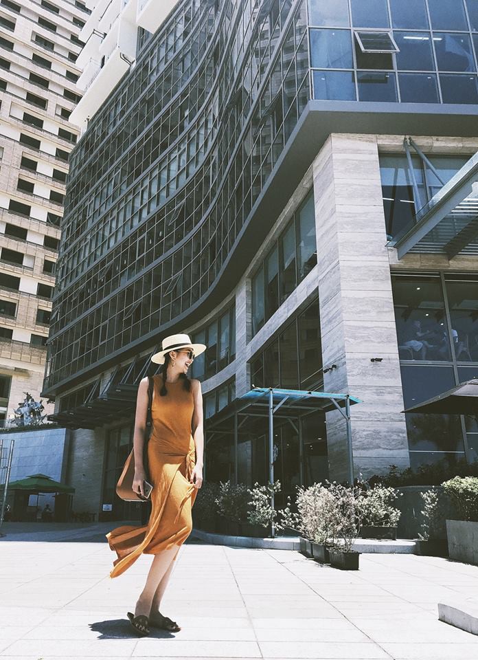 Tương tự như Hà Tăng, Thanh Hằng cũng lựa chọn một chiếc đầm trơn cho ngày nắng to. Sắc vàng mà nàng siêu mẫu lựa chọn vừa hợp mốt, phối cùng mũ cói rộng vành thật sự đúng bài.