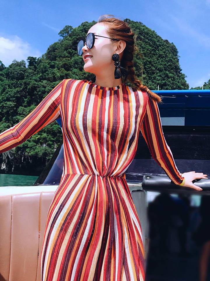 Minh Hằng có sự lựa chọn trội bật hơn với chiếc đầm kẻ sọc thể hiện nhiều sắc độ đa dạng của màu đỏ.