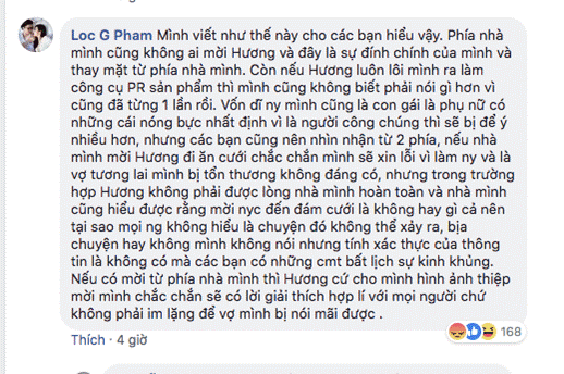 Nhưng trong trường hợp Hương không phải được lòng nhà mình hoàn toàn và nhà mình cũng hiểu được rằng mời người yêu cũ đến đám cưới là không hay gì cả nên tại sao mọi người không hiểu là chuyện đó không thể xảy ra. Bịa chuyện hay không mình không nói nhưng tính xác thực của thông tin là không có mà các bạn có những comment bất lịch sự kinh khủng. Nếu có mời từ phía nhà mình thì Hương cứ cho mình hình ảnh thiệp mời mình chắc chắn sẽ có lời giải thích hợp lí với mọi người chứ không phải im lặng để vợ mình bị nói mãi được".