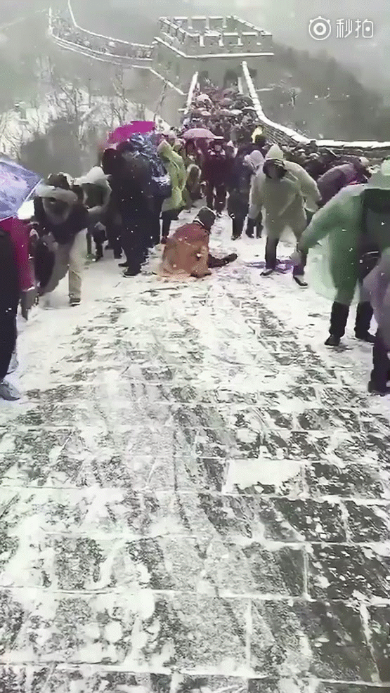 Mới đây, một đoạn clip đã được lan truyền trên mạng với nội dung khá hài hước xảy ra ở Trung Quốc. Trong đoạn clip này, một lượng khách du lịch "khổng lồ" đang đi thăm thú khu di tích lịch sử nổi tiếng bậc nhất Vạn Lý Trường Thành theo một cách không thể chật vật hơn vào mùa tuyết rơi.
