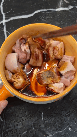 Với thịt ba chỉ, bạn rửa sạch rồi thái thành miếng nhỏ, mỗi miếng dày khoảng 1-1.5 đốt ngón tay là vừa đẹp. Cho thịt đã thái vào bát cùng 1 thìa canh nước hàng, 1 thìa canh nước mắm, 1 thìa cà phê hạt tiêu. Trộn đều và ướp thịt khoảng 5-7 phút.