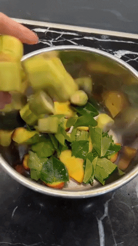 Riềng rửa sạch, cắt lát. Lá trà xanh rửa sạch, vò nát. Ớt để nguyên quả hoặc cắt nhỏ đều được nha.