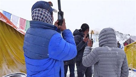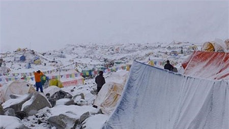 người nước ngoài đang cắm trại hoặc lên tới đỉnh núi Everest khi động