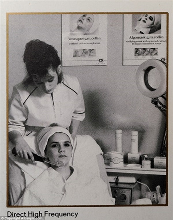 Victoria đang ngồi trên ghế với một chiếc khăn quấn quanh đầu chuẩn bị cho một liệu trình làm đẹp