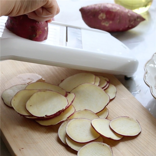 Rửa kỹ phần vỏ khoai lang cho hết đất. Tiếp đến, dùng dao bào để bào khoai thành các lát mỏng.