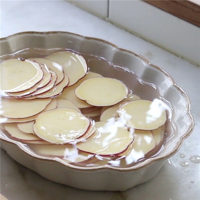 Sau khi bào xong, rửa khoai lang lại với nước. Tiếp tục ngâm khoai trong một bát nước khoảng 10 phút.