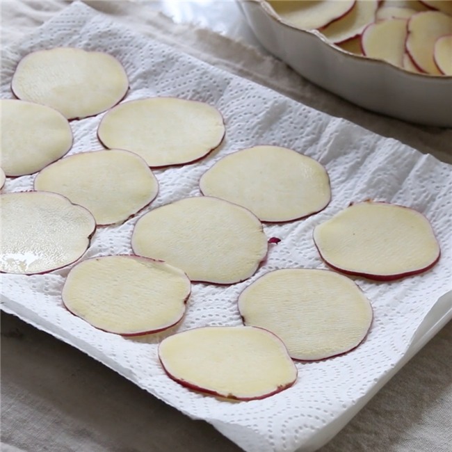 Khi khoai ngâm đủ thời gian thì vớt ra và thấm khô nước bằng giấy ăn.