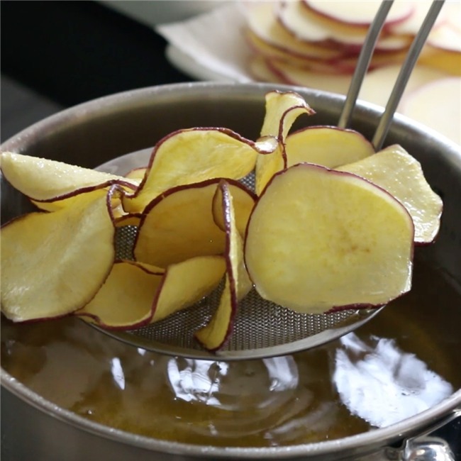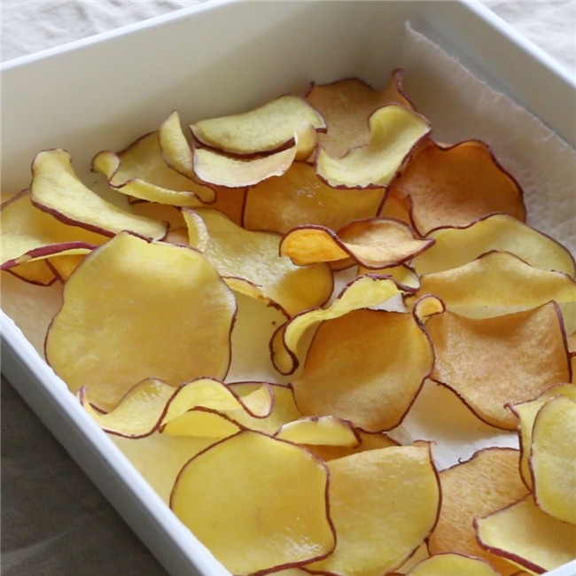 Thưởng thức một lát khoai lang chip giòn tan, kèm với chút mặn mặn mộc mạc của muối hay vị thơm ngậy của phô mai thật tuyệt vời trong những ngày thời tiết giao mùa như thế này. Đây cũng là một thức quà ăn vặt vừa ngon, vừa sạch cho các bé ở nhà nữa.
