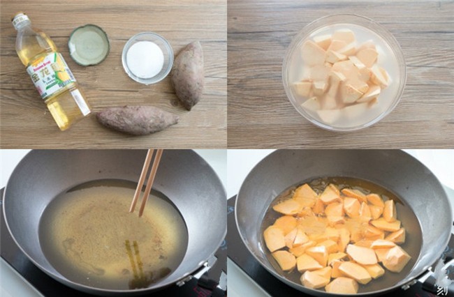 Đầu tiên, bạn gọt vỏ khoai lang sau đó cắt thành từng miếng vuông vừa ăn, khi cắt bạn nhớ ngâm khoai trong nước để khoai không bị đen nhé. Sau đó, vớt khoai ra rổ và để ráo. Bắc chảo ngập dầu lên bếp, khi dầu nóng đều thì cho khoai lang vào chiên vàng giòn (khoảng 8-10 phút).