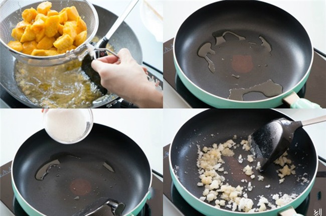 Lúc này bạn vớt khoai ra để ráo dầu. Trong một chảo chống dính, cho vào khoảng 1-2 muỗng canh dầu ăn, khi dầu nóng đều thì bạn cho đường trắng vào (ở lửa nhỏ).