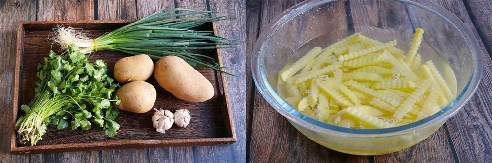 Vớt khoai tây ra bát, thêm 3g rau mùi tây thái nhỏ, 3g hành lá thái nhỏ, 3g tỏi băm vào.