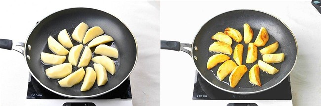 Khoai tây gọt vỏ, mỗi củ cắt thành 8 miếng bằng nhau hình múi cau. Đun nóng dầu ăn trong chảo, cho khoai tây vào chiên chín vàng đều thì gắp ra đĩa.