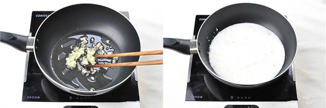 Sau khi chiên khoai tây bạn chắt bớt dầu ăn thừa trong chảo vào bát, chỉ để lại một ít trong chảo để cho tỏi vào xào thơm. Tiếp đấy đổ sữa vào đun sôi.