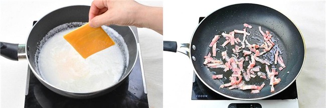 Cho phô mai vào chảo sữa vừa đun vừa khấy cho phô mai tan ra rồi tắt bếp. Lấy một chảo khác cho một ít dầu ăn vào đun nóng rồi cho thịt dăm bông vào đảo chín.