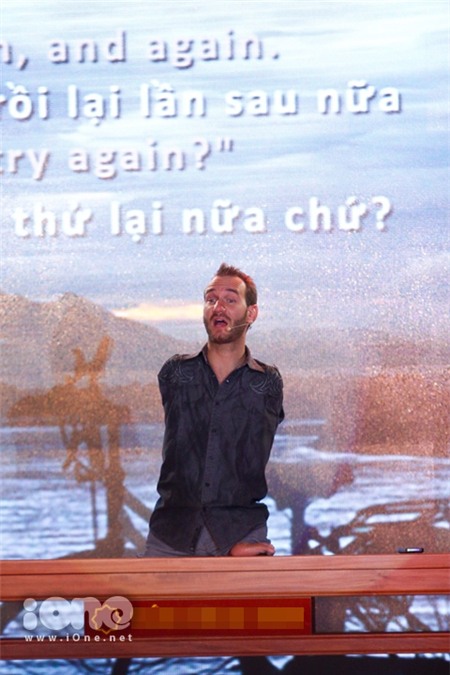 | Mặc dù chỉ có hai ngón chân, song Nick vẫn thoải mái di chuyển trên bàn dài để minh họa cho bài diễn thuyết của mình. |