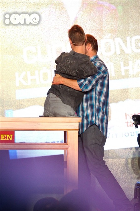 | Khoảnh khắc xúc động ở cuối chương trình, khi MC Diễm Quỳnh thay mặt khán giả ôm tặng Nick Vujicic. |