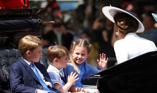 Hàng chục nghìn người đã đổ về trung tâm London để chứng kiến cuộc diễu hành Trooping the Colour với sự góp mặt của 1.500 cận vệ, kỵ binh và đoàn quân nhạc 400 người di chuyển theo đội hình trước Cung điện Buckingham. Đây là lần đầu tiên 3 con nhà Công nương Kate được tham gia diễu hành trên xe ngựa cùng mẹ và bà nội.