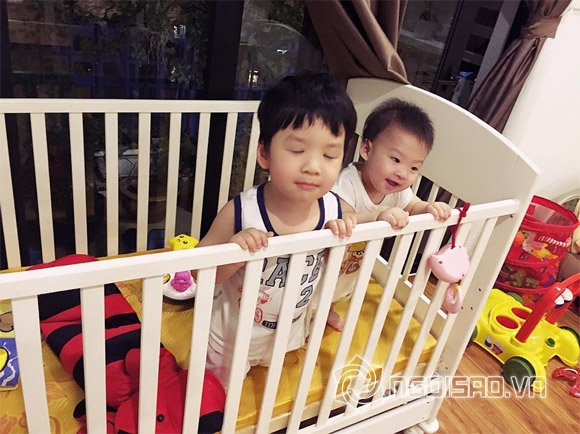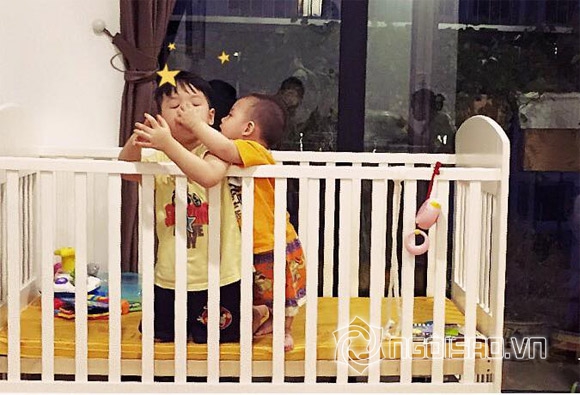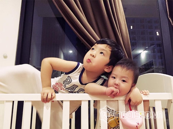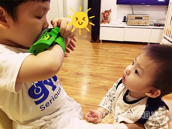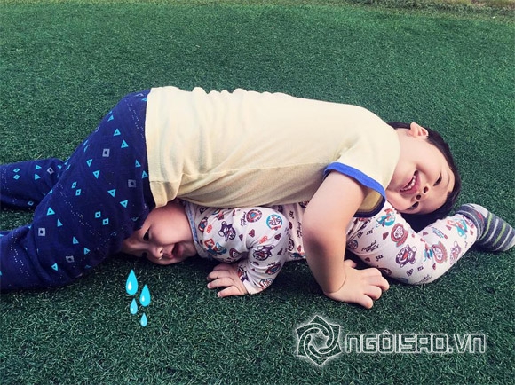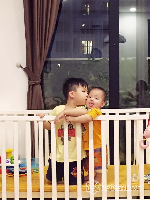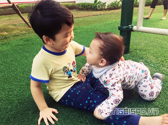 Trong loạt ảnh, bé Khải Minh và Khải Nguyên đều sở hữu gương mặt đẹp trai, thông minh. Hai bé vui đùa với nhau rất thích thú và vô cùng tình cảm. Theo lời Đan Lê bày tỏ, con trai thứ hai đang mọc răng, nên bé rất khó chịu. Tuy nhiên, khi chơi với anh, thì em lại rất thích thú.