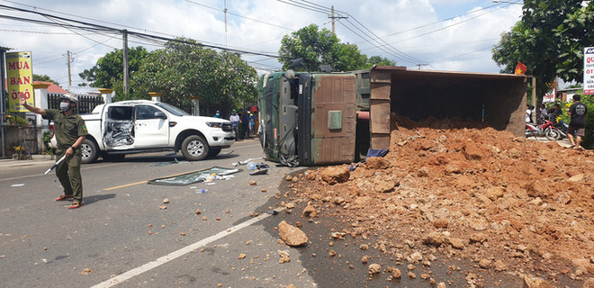 Tình huống bất ngờ này khiến tài xế không làm chủ được tay lái, xe ben lật nhào, đất đá trên xe đổ chắn ngang đường. Cùng lúc đó, một chiếc xe bán tải màu trắng chạy hướng ngược chiều (từ Bà Rịa về Châu Đức) cũng bị xe ben đâm phải, xoay ngang đường. Thêm chiếc xe máy do một học sinh điều khiển cũng bị hất văng vào lề đường.