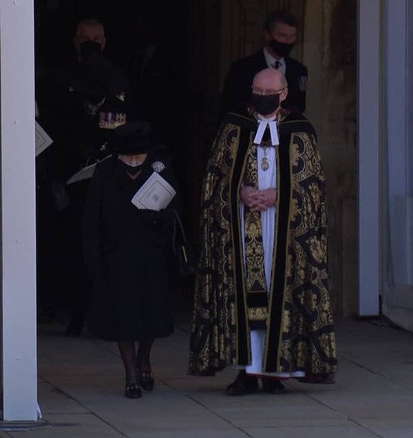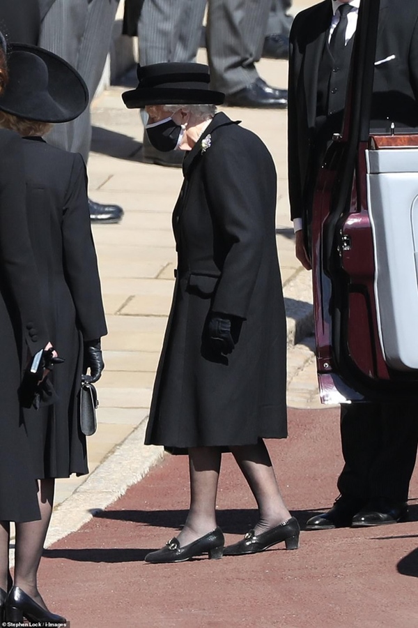 Nữ hoàng đi đến Nhà nguyện bằng chiếc Bentley cùng với Phu nhân Susan Hussey, người phụ nữ đáng tin cậy của bà. Cả 2 đều đeo khẩu trang màu đen để đảm bảo an toàn trong đại dịch Covid-19.