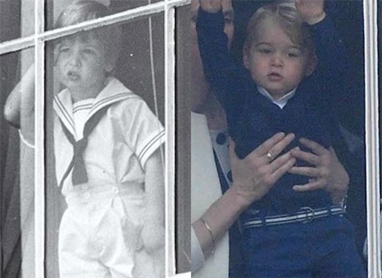 Hoàng tử William và Hoàng tử nhí George cùng đứng ở cửa sổ nhìn ra bên ngoài buổi diễu hành "Trooping the Colour"