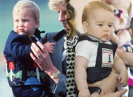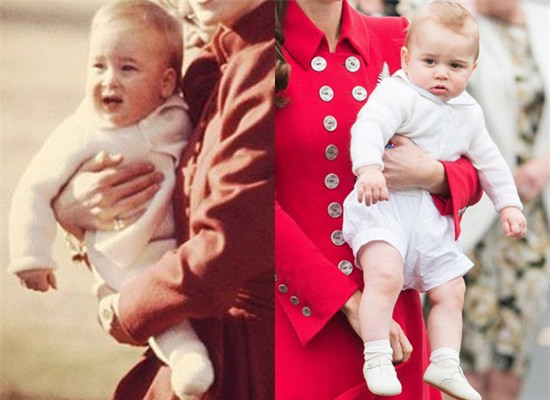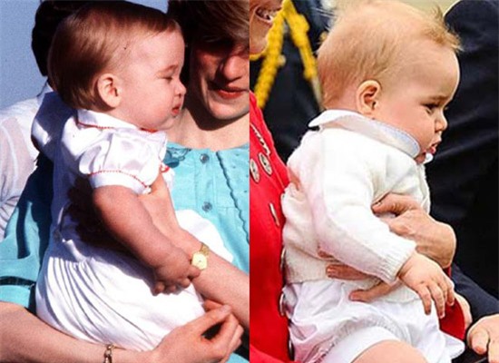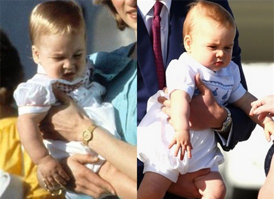 So sánh hình ảnh Hoàng tử William (trái) và Hoàng tử bé George (phải) khi vừa đến New Zealand có thể thấy, ở cùng độ tuổi hai người rất giống nhau. Cả hai trông rất thoải mái, lanh lợi thu hút sự chú ý đặc biệt của mọi người